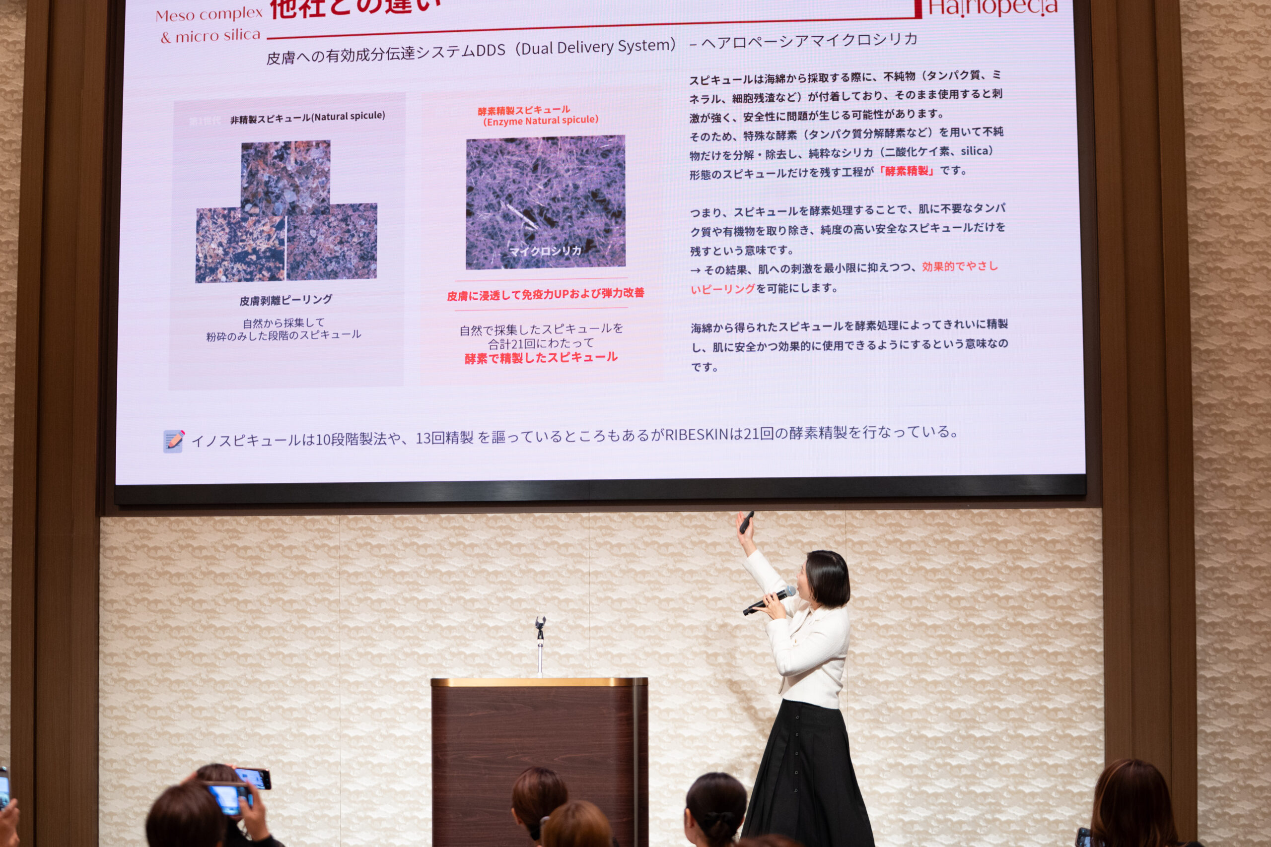 メインイベント、”カーボキシーの母”でおなじみのミス・Lee先生による「ヘアロペーシア」の新商品発表が行われました。